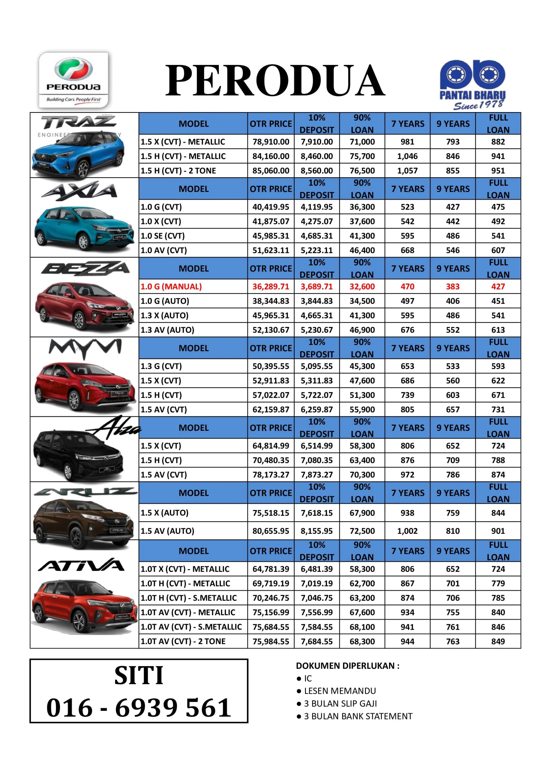 Promosi Perodua Terkini - Penasihat Jualan Perodua Pilihan Ramai, Siti Perodua merupakan penasihat jualan Perodua yang sah dan berdaftar. Perkhidmatan saya meliputi seluruh kawasan di Lembah Klang & seluruh Malaysia. Saya menawarkan pelbagai model dan promosi terkini dari Perodua antaranya Perodua Ativa, Perodua Arus, Perodua Axia, Perodua Myvi, Perodua Bezza dan Perodua Alza. Saya berpengalaman lebih 10 tahun sebagai penasihat jualan Perodua dan saya telah bantu ramai pelanggan mendapatkan kereta idaman mereka. Saya juga menawarkan khidmat nasihat dan pencerahan secara percuma untuk pelanggan-pelanggan.